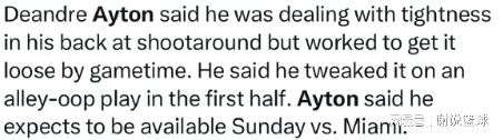 然而在比赛结束以后,湖人包括球迷们,就跟着紧张了起来。根据名记大卫-麦克米兰的报道,湖人先发中锋艾顿又出现伤情,而且看上去有点麻烦。赛后艾顿接受大卫-麦克米伦采访,透露赛前他进行了惯例热身,当时就感觉到背部紧绷,但还是坚持出战。然而艾顿在比赛中,试图完成一次空中接力,背部似乎又扭伤了。