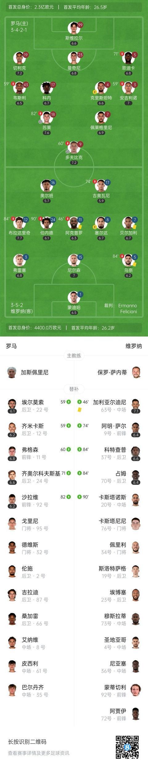 全场比赛结束,罗马2-0维罗纳。